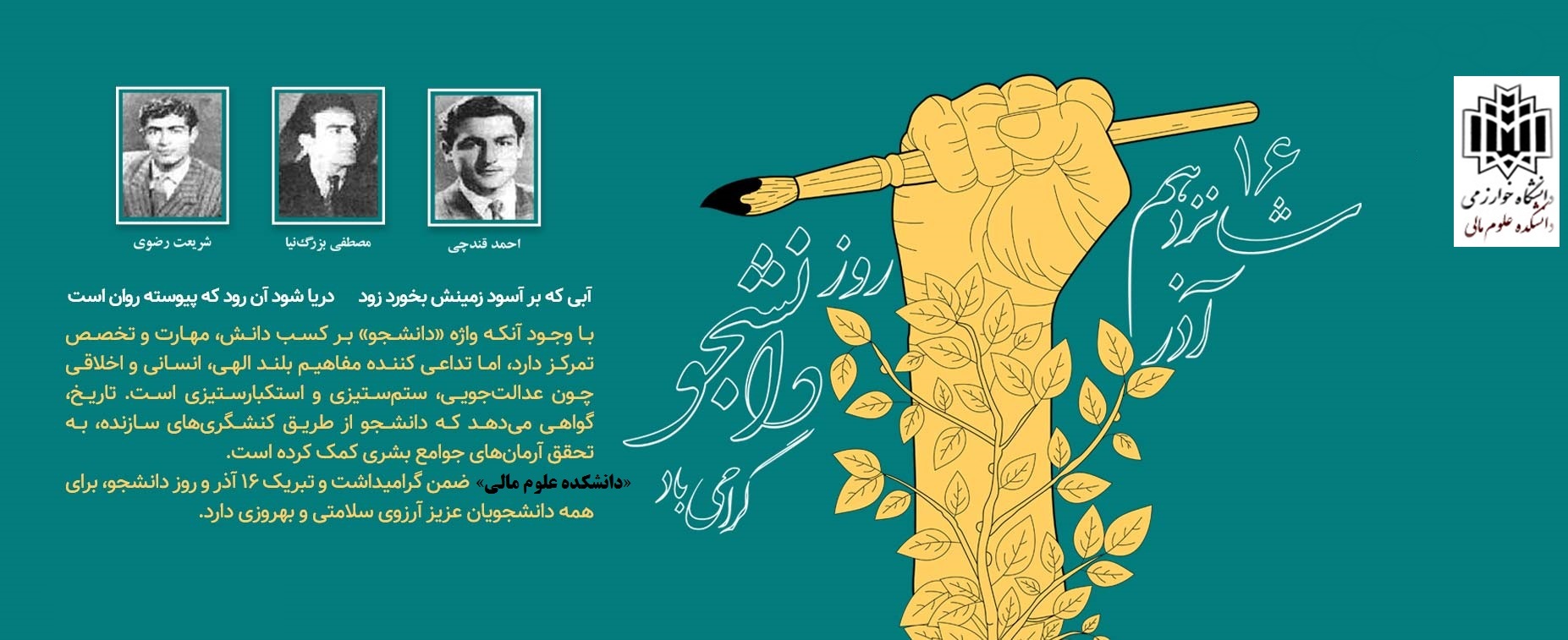در سالروز گرامیداشت روز دانشجو، پویایی همیشگی در فکر و اندیشه، انگیزه‌ای قدرتمند و مقدس برای رسیدن به اهداف علمی و حرفه‌ای، و تلاشی مستمر و خستگی‌ناپذیر را برای همه دانشجویان متعهد دانشکده علوم مالی آرزومندیم.