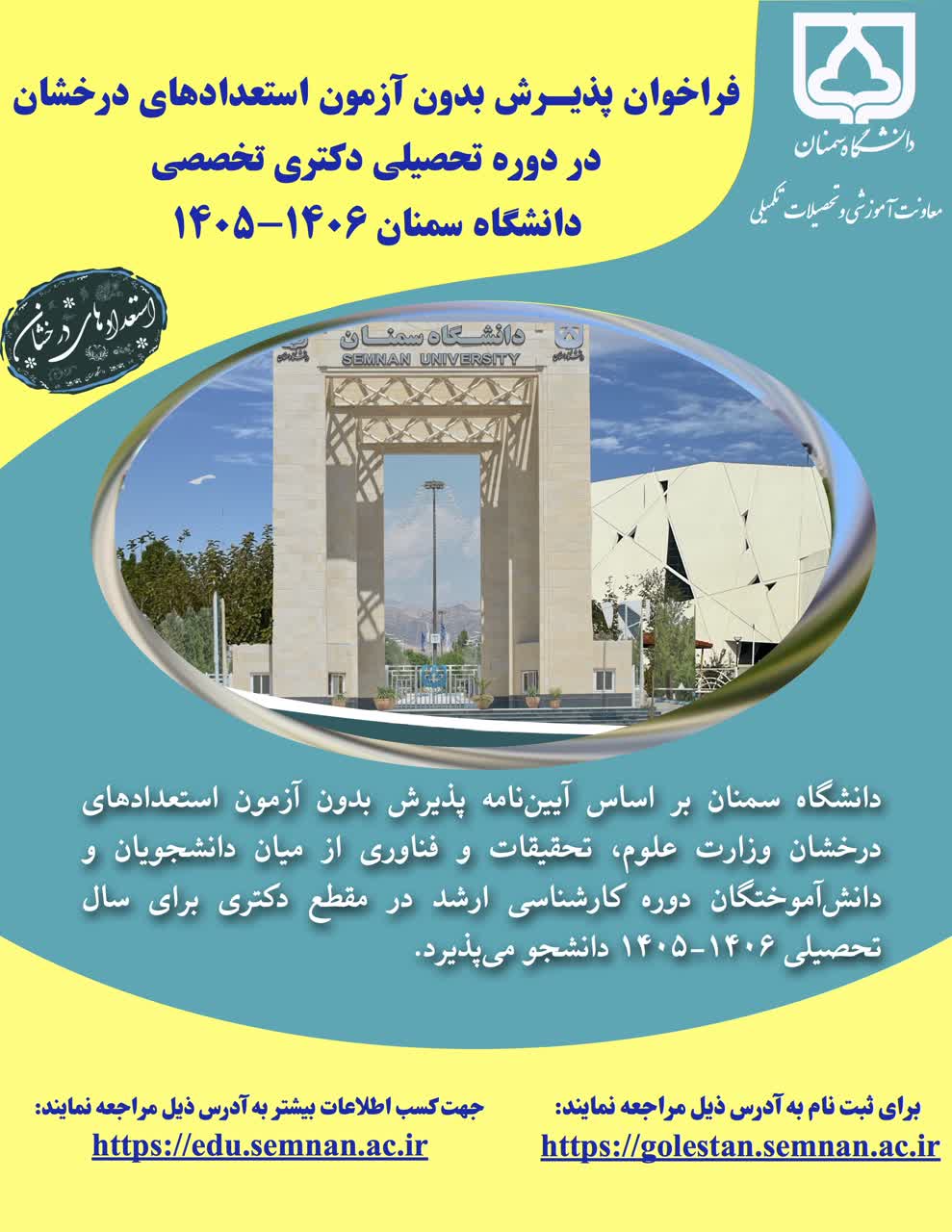 پذیرش بدون آزمون (استعداد درخشان) در مقطع دکتری دانشگاه سمنان سال تحصیلی ۱۴۰۶-۱۴۰۵