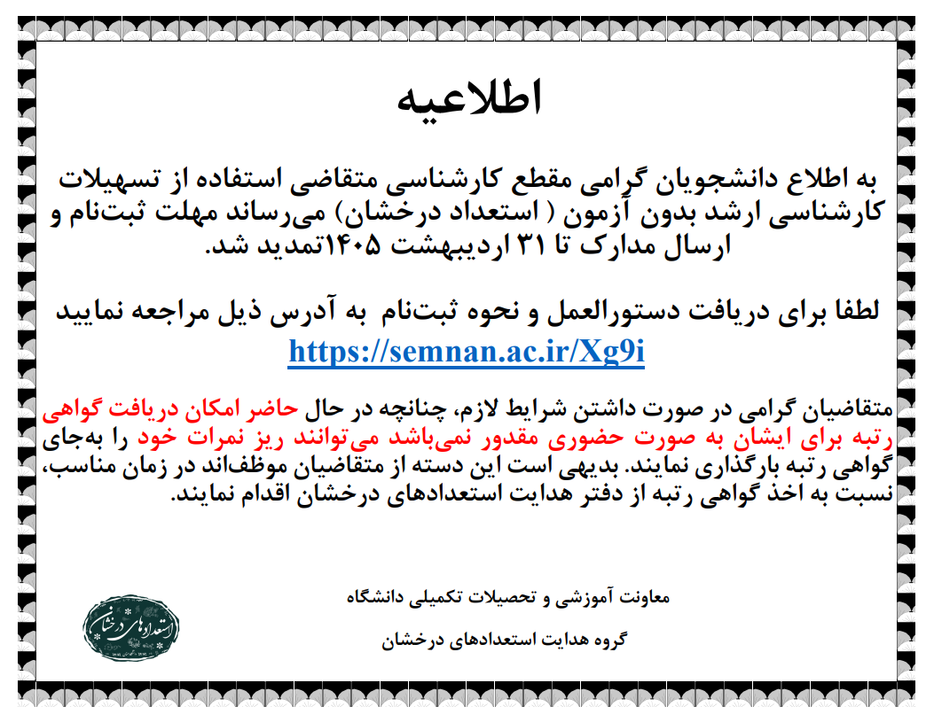 تمدید پذیرش بدون آزمون استعداد درخشان مقطع ارشد دانشگاه سمنان سال ۱۴۰۵