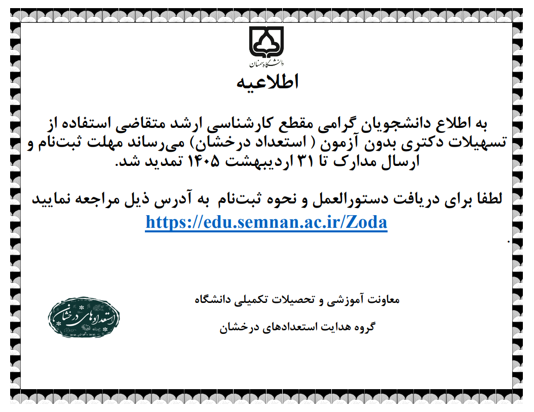 تمدید پذیرش بدون آزمون (استعداد درخشان) در مقطع دکتری دانشگاه سمنان سال تحصیلی ۱۴۰۶-۱۴۰۵